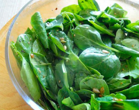 Place spinach in a mixing bowl. Add toasted seeds and dressing. Lightly toss ingredients and plate.